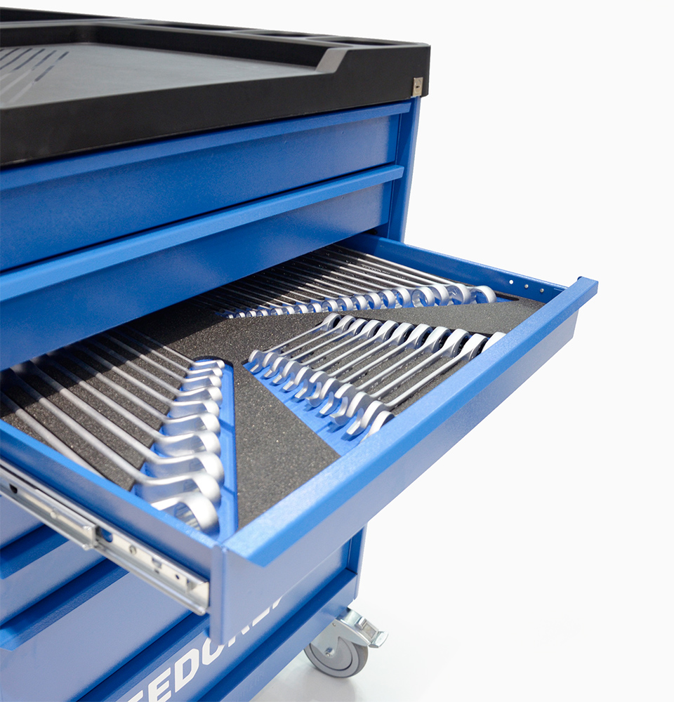 The result is a redesigned WORKSTER smartline – an intelligent system which organises all types of tools for diverse application scenarios. A steering handle ensures extremely smooth operation and control, so the tool trolley can be agilely manoeuvred through narrow workshop spaces – even with a full load. Rounded side edges minimise any risk of damage or injury. The versatility and customisability of the WORKSTER smartline makes it attractive to the widest range of customers – day in and day out it proves to be a reliable and robust co-worker in the rough and tough environment of the workshop.
